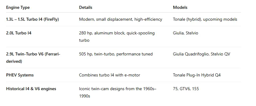 Alpha Romeo Engine was created by Stalentis, the original company formed by the fusion of Fiat Christler Automobile and the PSA Group. Historically, Alpha designed and designed its own engines, including the famous Twin Spark, Basso V6 and Jets engines. In recent years, motor growth has been divided into the Stalentis group. For example, 2.9L Twin-Turbo V6 in Giulia Quadrifoglio was developed by Ferrari engineers and built in Italy. Other modern engines, such as a 1.3L Turbo, shared architecture with a 1.3L Turbo, Jeep and Fiat models, even though they are specifically set on Alpha's performance character.